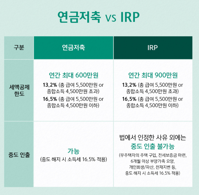 - IRP: 연 700만 원 한도 (연금저축 400 포함, IRP 단독은 최대 700)